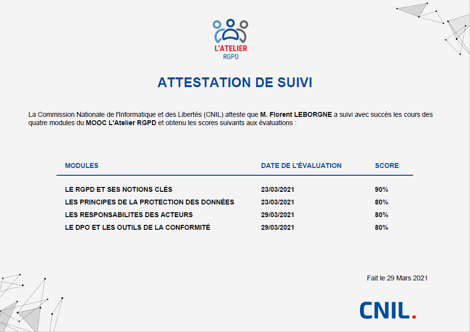Suite a ma formation dans les locaux de l’ecole Aristée, j’ai été amener a réaliser un MOOC proposer par la CNIL, je l’ai obtenu comme affiché ci-dessous: