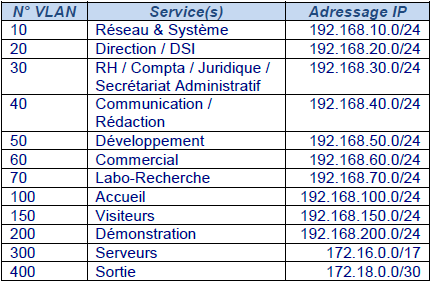 L’organisation des VLAN et de l’adressage IP est la suivante :