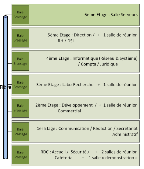 Chaque étage dispose d’une baie de brassage qui le relie par une fibre à la baie centrale de la salle serveurs.