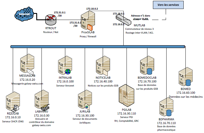 Le serveur de messagerie et l’intranet sont limités à un usage interne au site parisien. Des services externalisés (relai de messagerie auprès de l’opérateur et recopie d’une partie du serveur intranet sur le serveur Web hébergé chez un prestataire) permettent aux visiteurs médicaux d’utiliser la messagerie de l’entreprise et d’avoir accès aux principales informations de l’intranet (Comité d’entreprise, circulaires importantes, stratégie de l’entreprise, comptes rendus de CA, etc.).